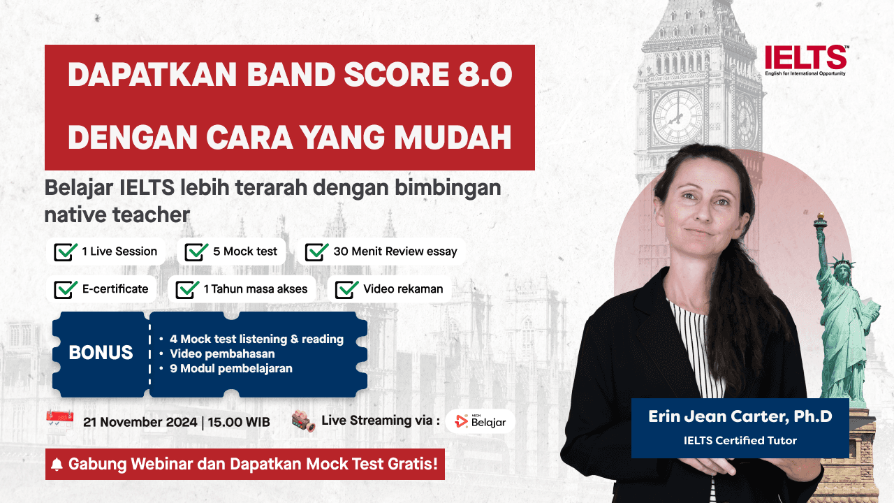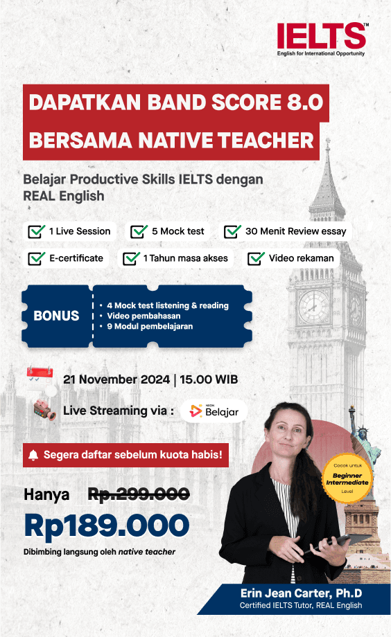 Neon Education hadir bersama REAL English, lembaga bimbingan Bahasa Inggris terpercaya selama lebih dari satu dekade, mengadakan program Mastering IELTS: Live Session & Mock Test yang langsung dibimbing oleh native teacher!