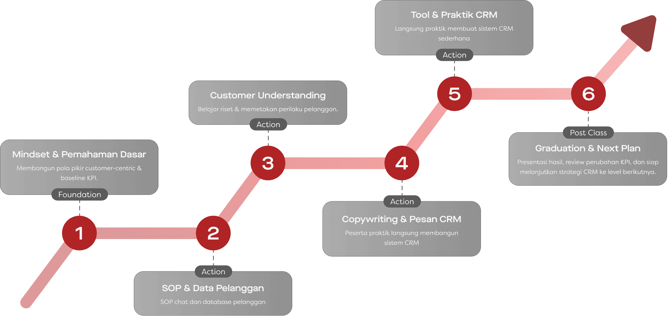 Program berbasis cohort yang memandu bisnis membangun sistem retensi pelanggan berbasis CRM secara end-to-end: strategi, SOP operasional, eksekusi WhatsApp/Chat, hingga pengukuran KPI. Terdiri dari 6 sesi live (2 jam/sesi), 2 sesi coaching, mini project, dan sertifikat.