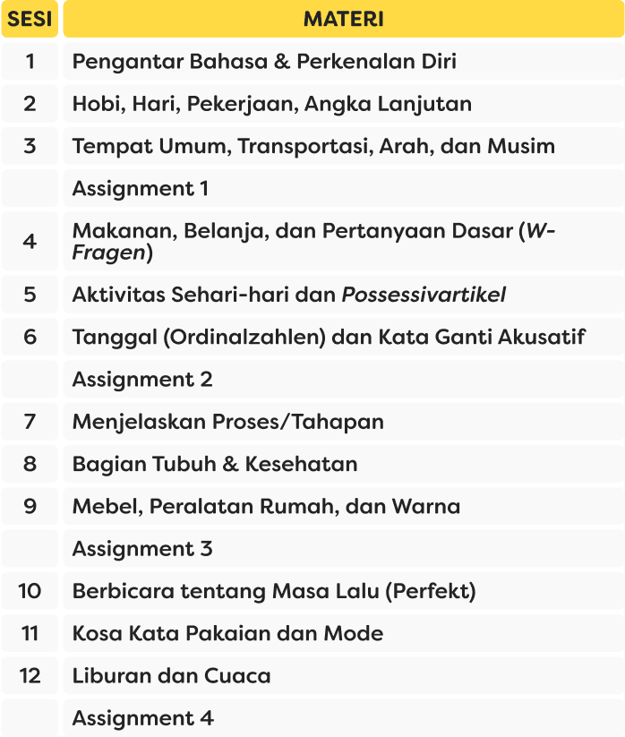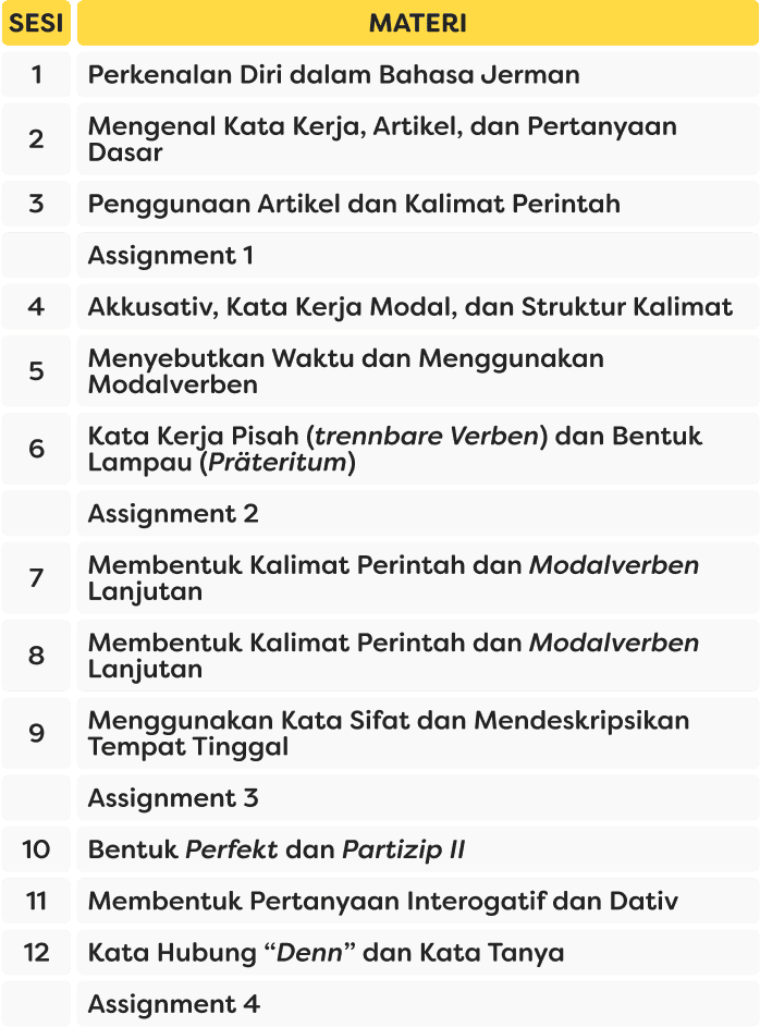 Materi yang diajarkan telah disusun berdasarkan standar pembelajaran bahasa Jerman dan dirancang untuk membantu peserta mencapai kompetensi di tingkat A1.