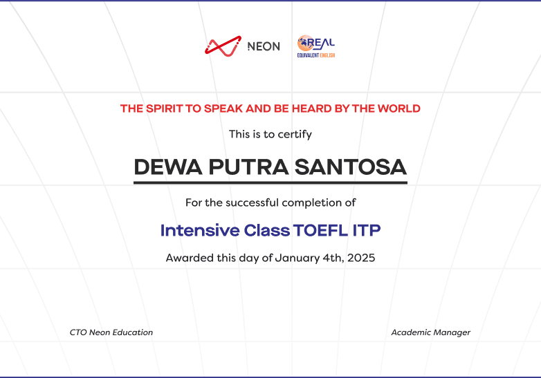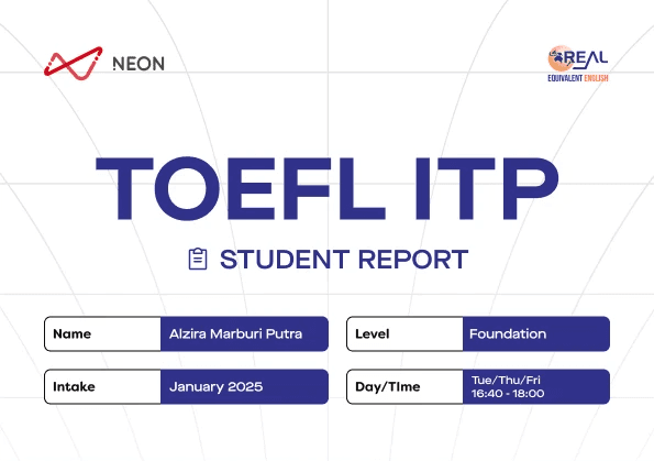Program kelas TOEFL ITP adalah hasil kolaborasi unik antara Neon Education, platform pembelajaran modern yang mendukung pengalaman belajar online yang interaktif, dan Real English, lembaga kursus bahasa Inggris terkemuka yang berpedoman pada kurikulum CEFR (The Common European Framework of Reference for Languages). Real English juga telah diakui sebagai: