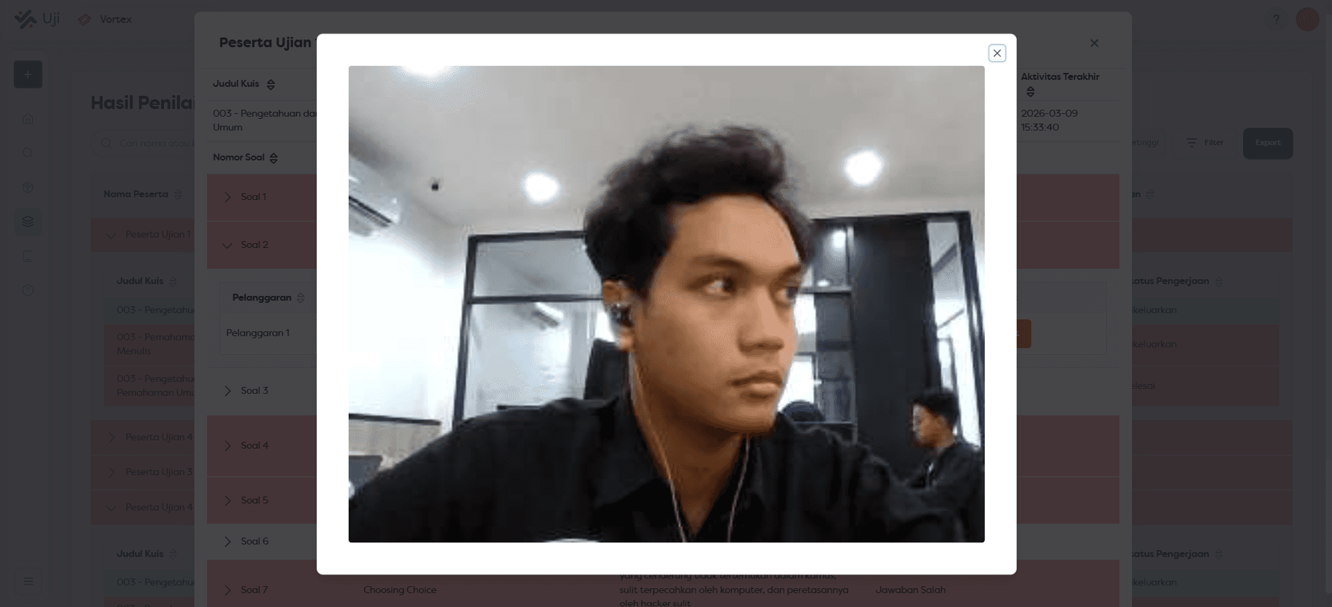 Timeline Insiden Kronologis: Setiap pelanggaran ditampilkan dalam urutan waktu, mulai dari perpindahan tab, keluar aplikasi, hingga gerakan mencurigakan yang terdeteksi kamera.