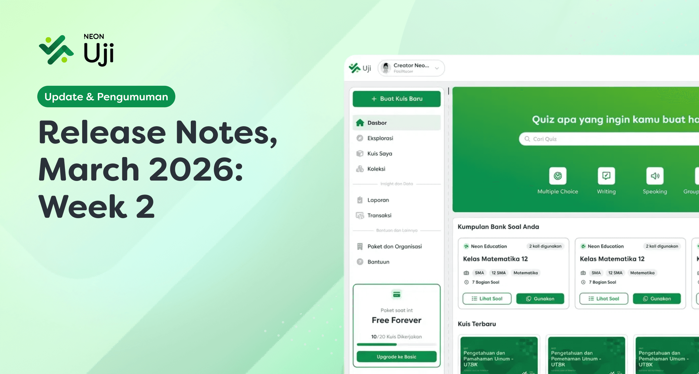 Pada minggu kedua bulan Maret 2026, kami merilis pembaruan fitur terbaru di Neon Uji.