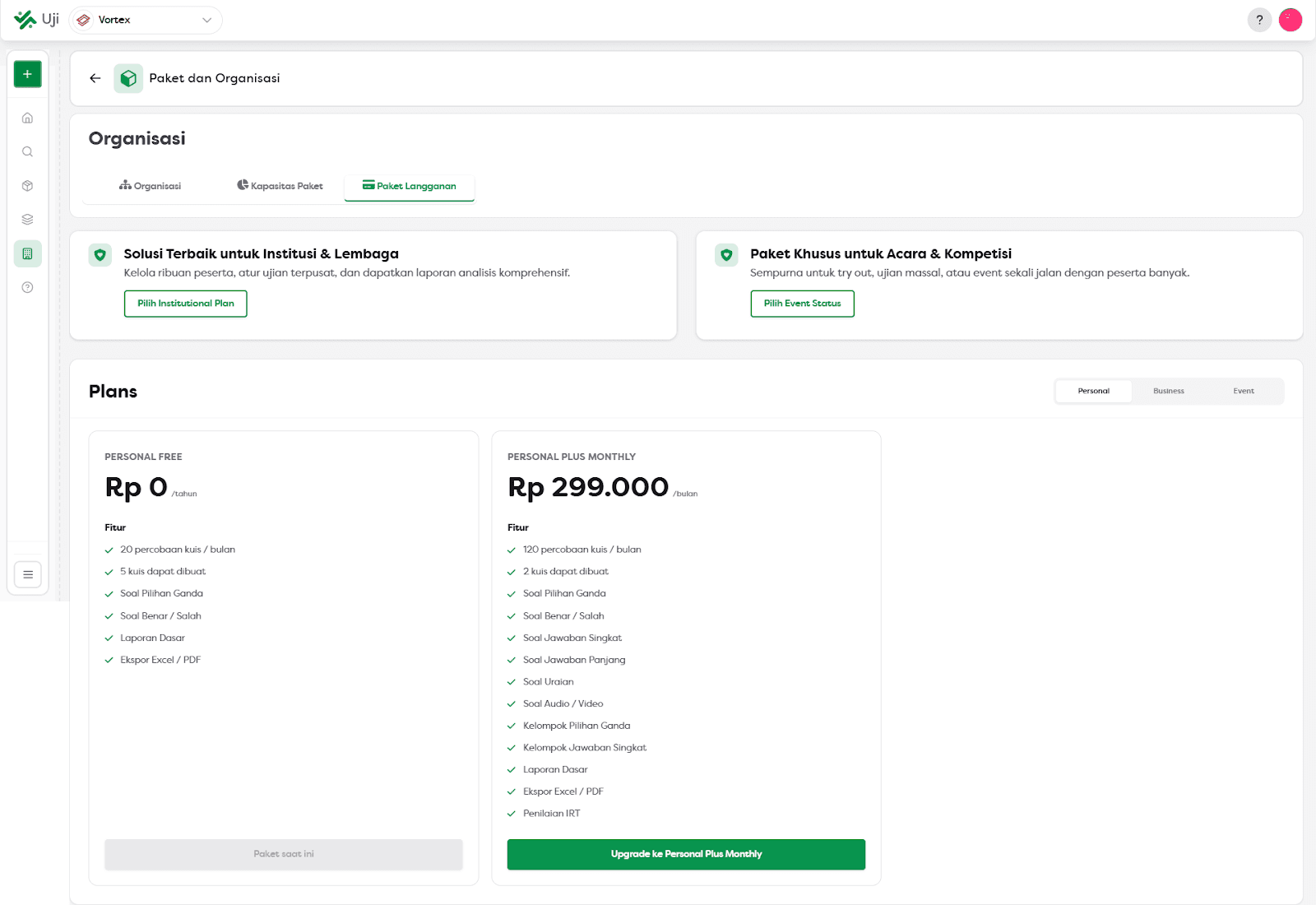 Pembelian Mandiri tanpa Perantara: Pengguna dapat memilih paket dan menyelesaikan pembayaran sepenuhnya secara mandiri tanpa perlu menghubungi tim sales atau menunggu proses manual untuk mengaktifkan paket langganan.